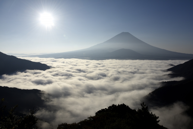 落ち葉を踏みしめながら静かな森を登り、稜線に出た先にあるのは、富士山と湖を見渡す大パノラマ。 ここから見る富士山は、手前にある大室山を抱っこしているように見えることから「子抱き富士」と呼ばれ、写真家にも人気の珍しい姿です。