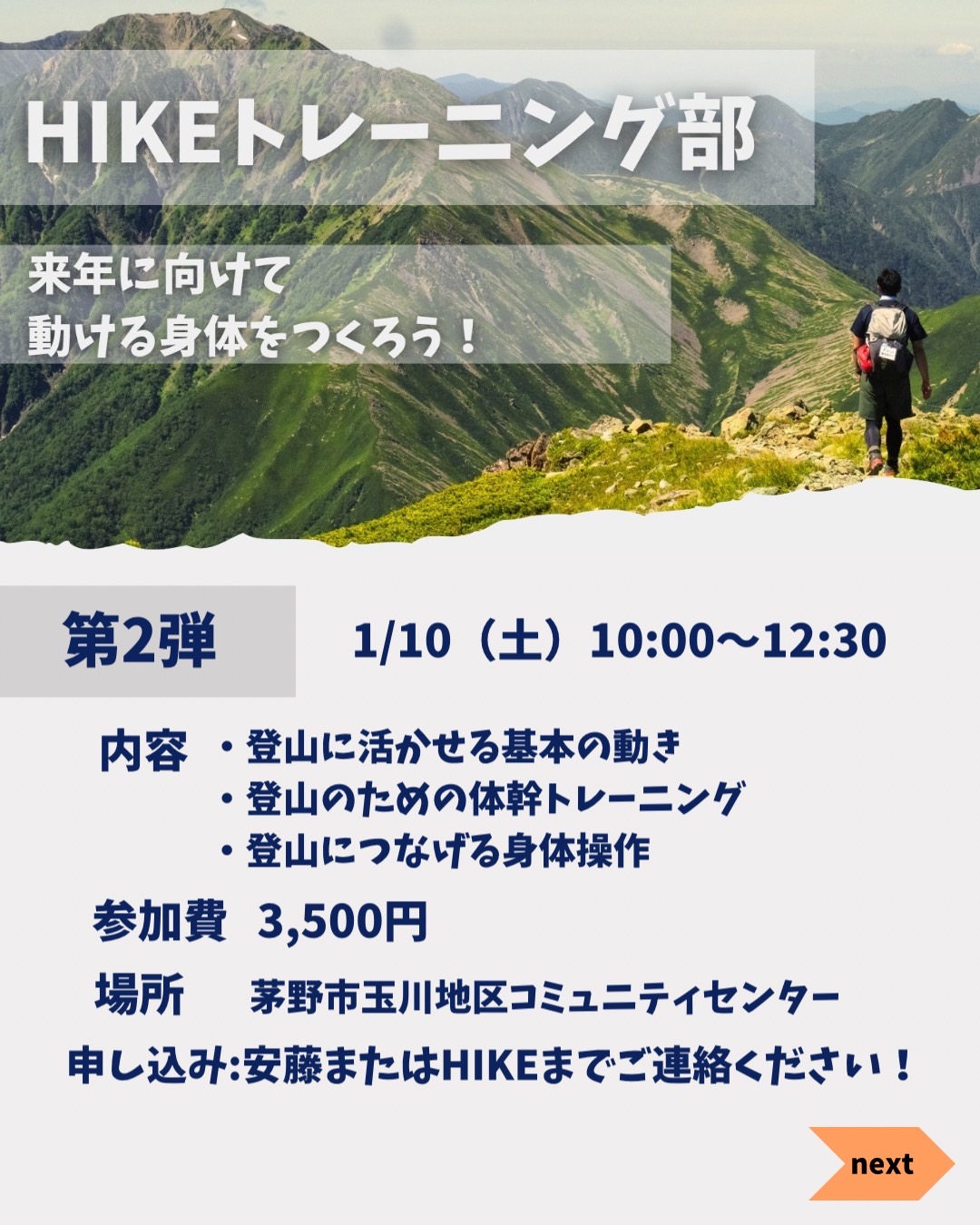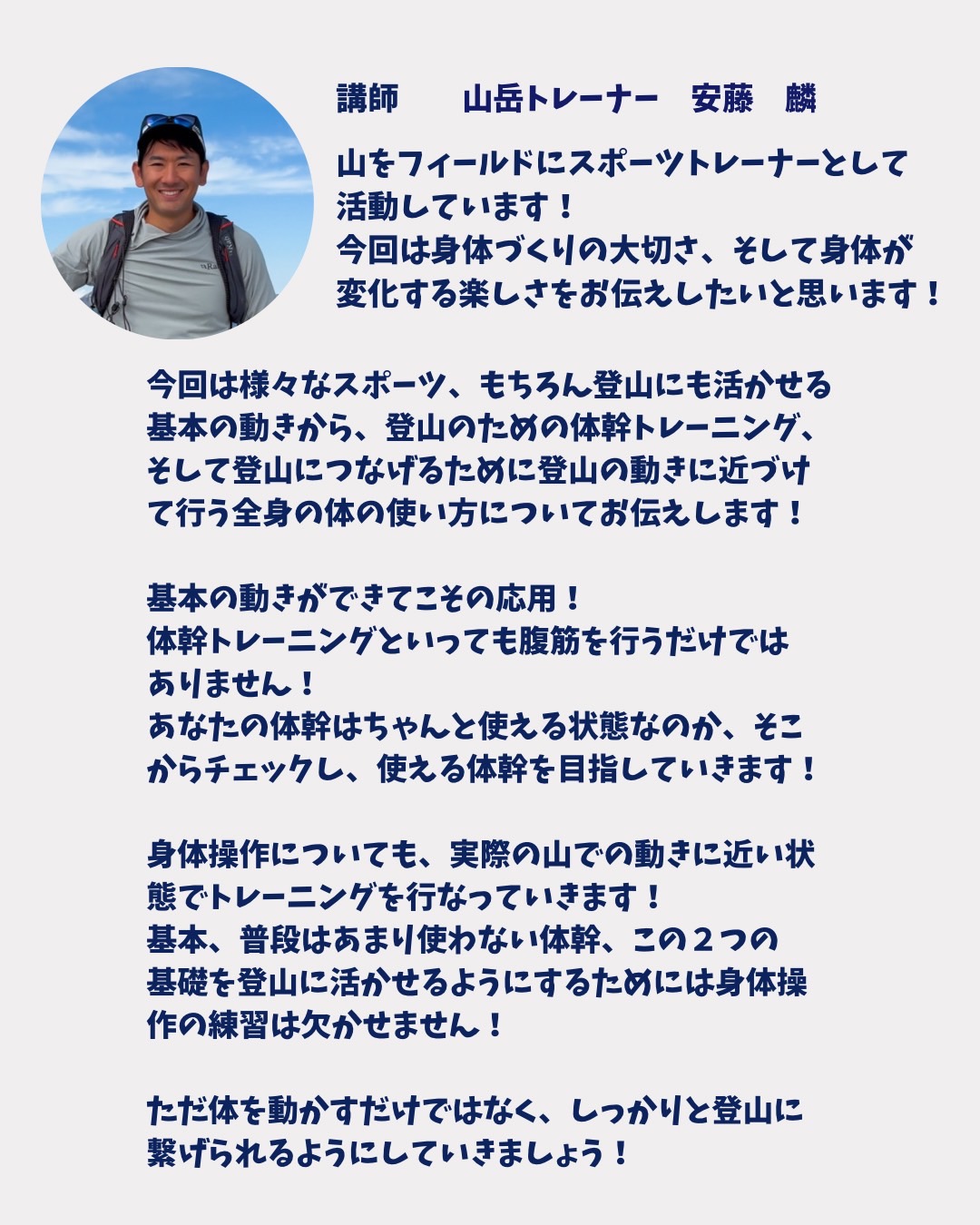 今回は登山に活かせる基本の動き、登山のための体幹トレーニング、登山につなげる身体操作を