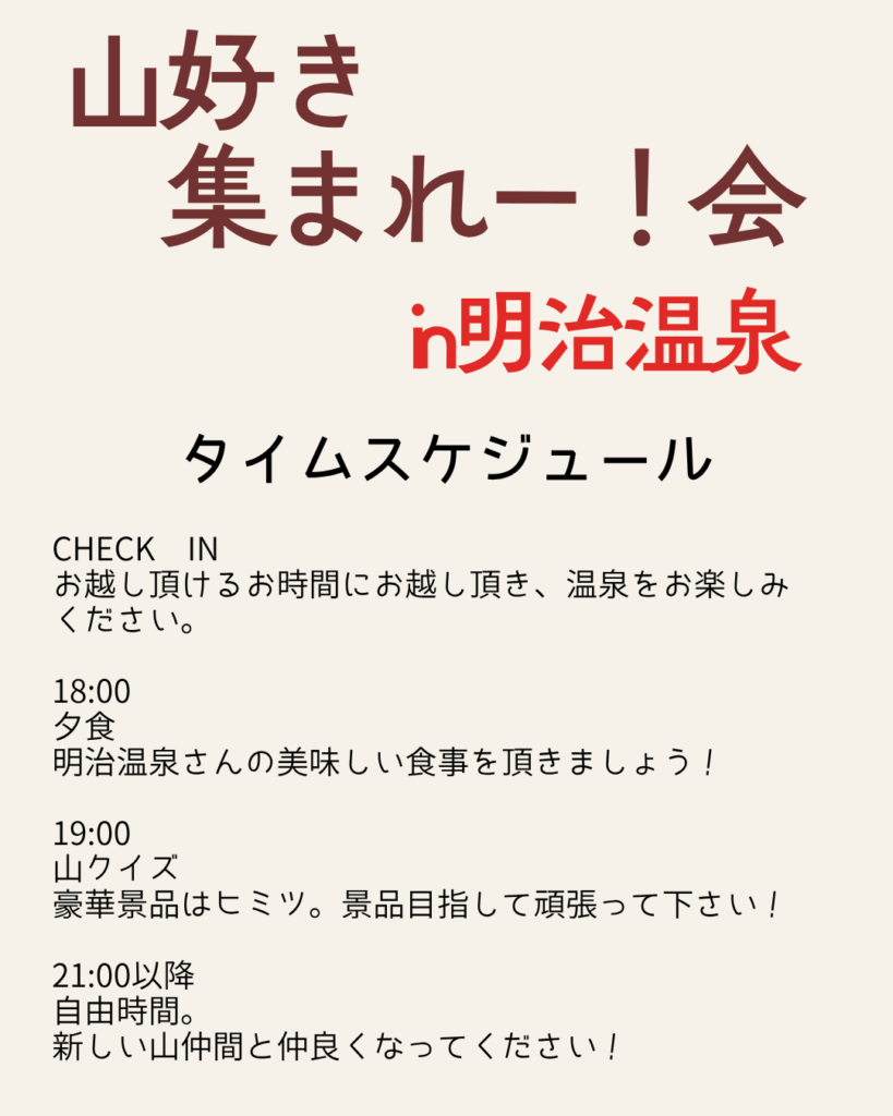 温泉に入ってご飯を頂いて、山クイズやりましょう!