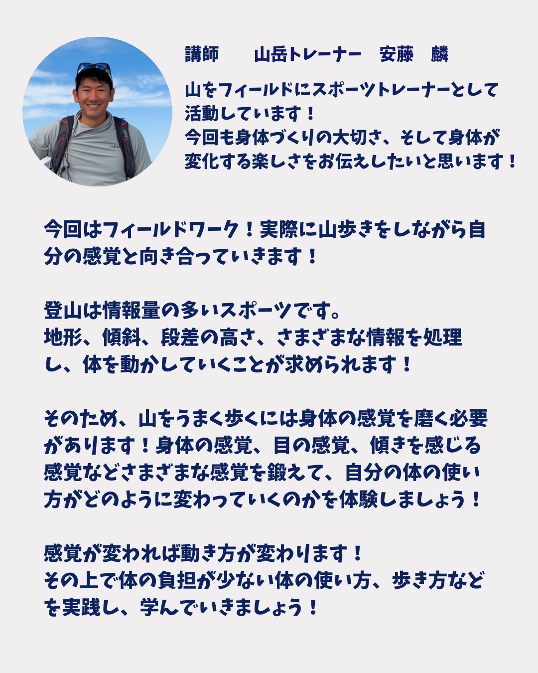 今回はフィールドワークで登山中の身体の使い方を学んでいきます!